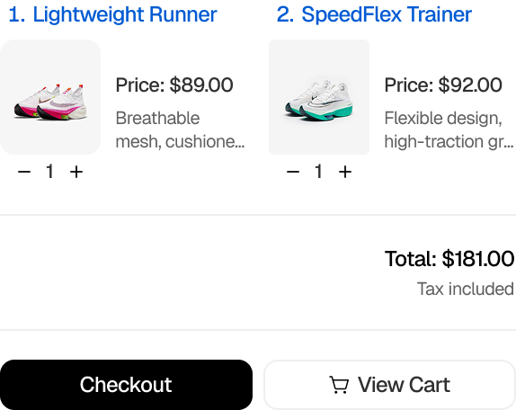 Turn every question into a sales opportunity. Suggest products based on customer intent, budget, or browsing history — all personalized and ready to add to cart.